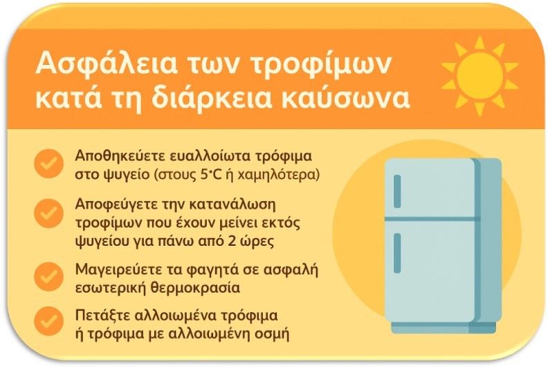 - Μην αφήνετε τα ευαλλοίωτα τρόφιμα στην επικίνδυνη ζώνη θερμοκρασίας (5-60°C) για συνολικό διάστημα μεγαλύτερο των 2 ωρών.