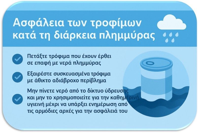 - Απορρίψτε τρόφιμα σε ανοιχτές συσκευασίες που έχουν έρθει σε επαφή με νερά πλημμύρας.